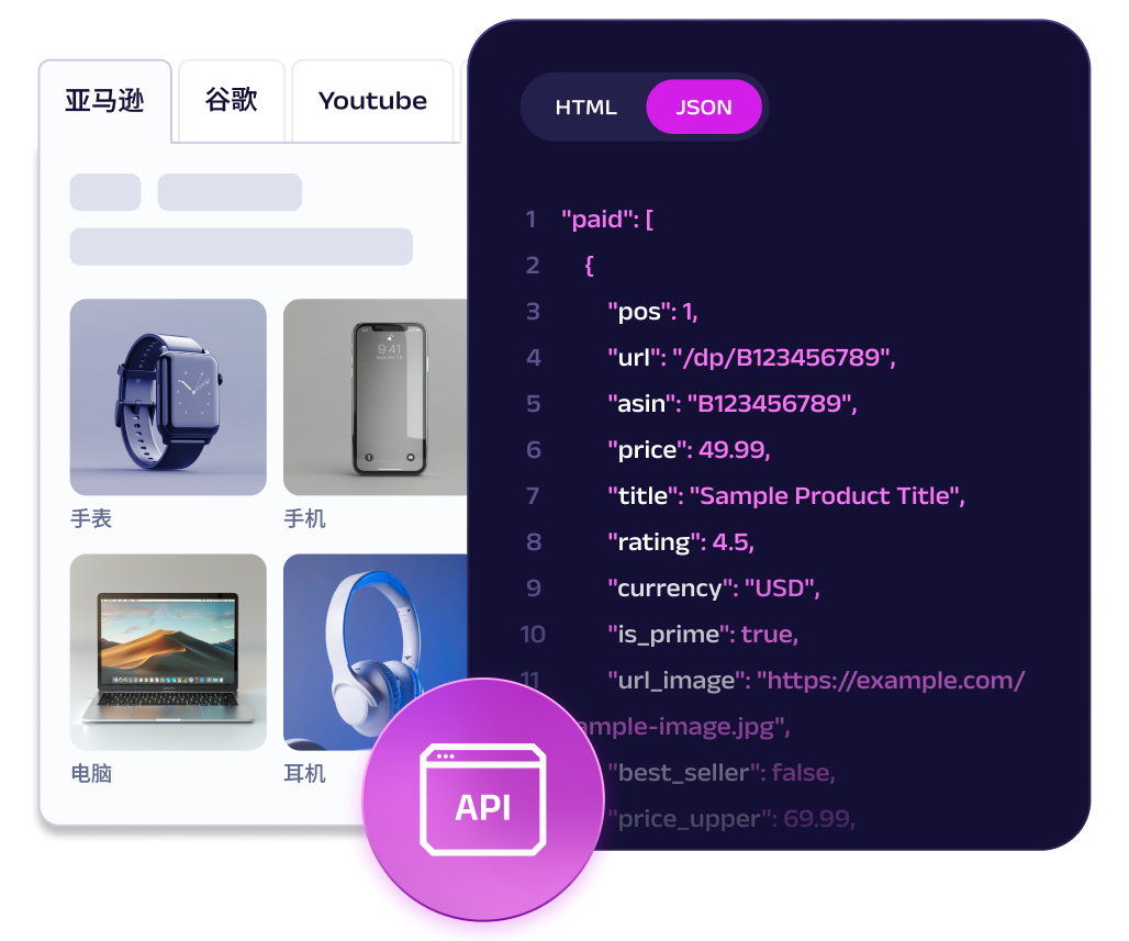 网络爬虫API可以从任何网页(包括电子商务网站和SERP)收集原始HTML数据或结构化JSON数据。而且,它还能利用JavaScript渲染功能,从使用JavaScript进行动态内容加载的网站检索数据。